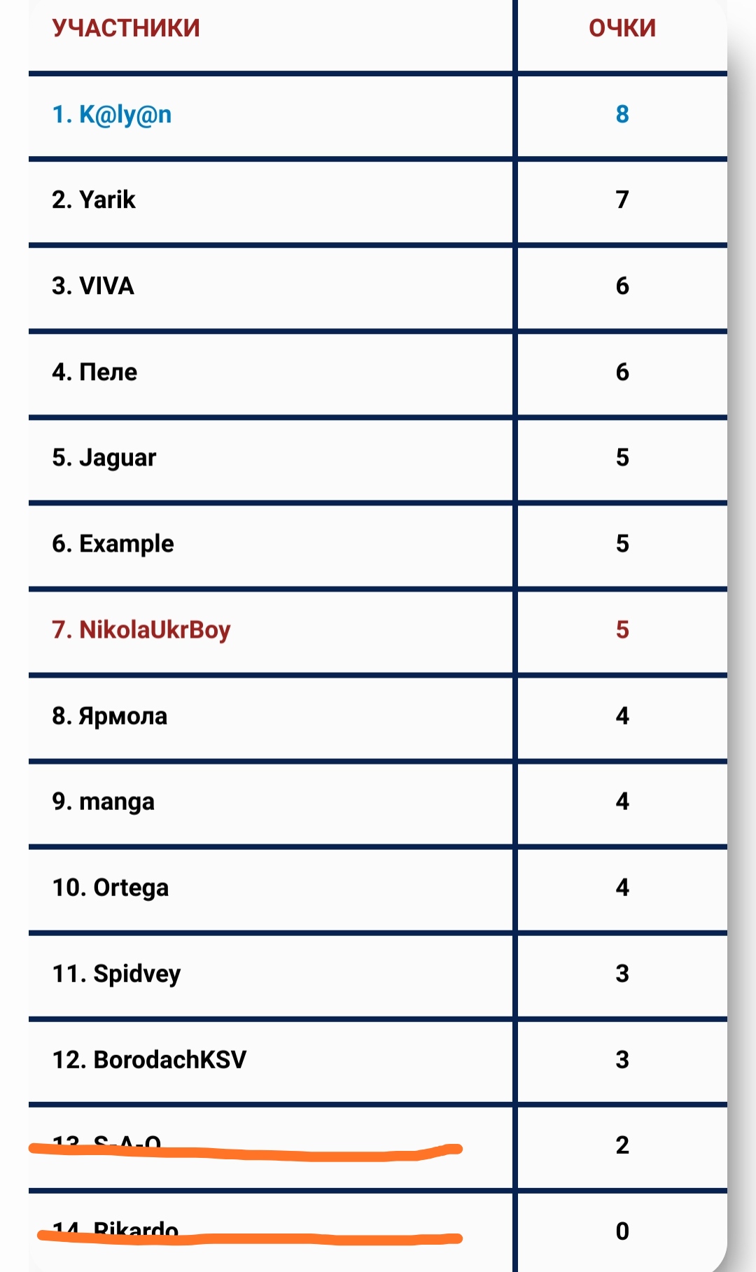 Самое слабое звено - NikolaUkrBOY "6" баллов, согласно регламенту покидает турнир.