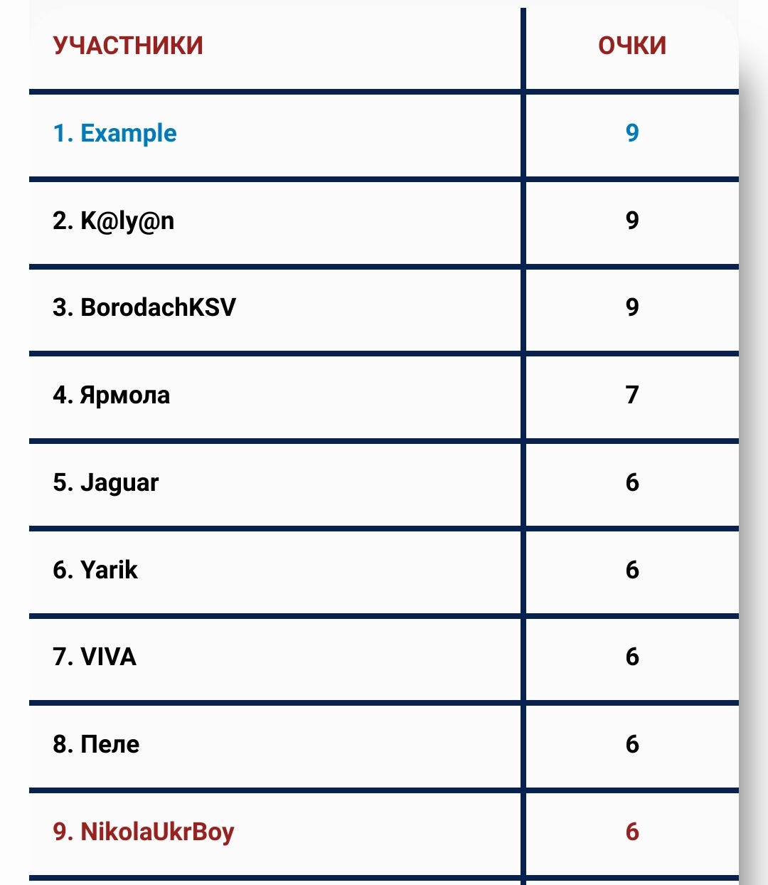 Лидеры тура - Example. K@ly@n. BorodachKSV "9" баллов.